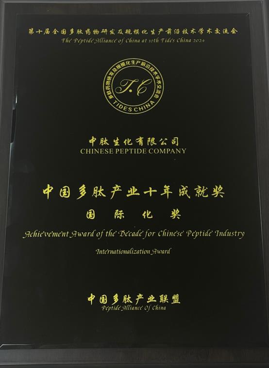 近日,中肽生化有限公司(Chinese Peptide Company)于第十屆多肽藥物研發(fā)及規(guī)?;a(chǎn)前沿技術(shù)交流會(huì)中榮獲“中國(guó)多肽產(chǎn)業(yè)十年成就獎(jiǎng)-國(guó)際化獎(jiǎng)”獎(jiǎng)項(xiàng)。