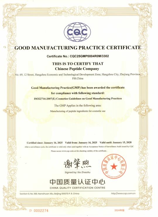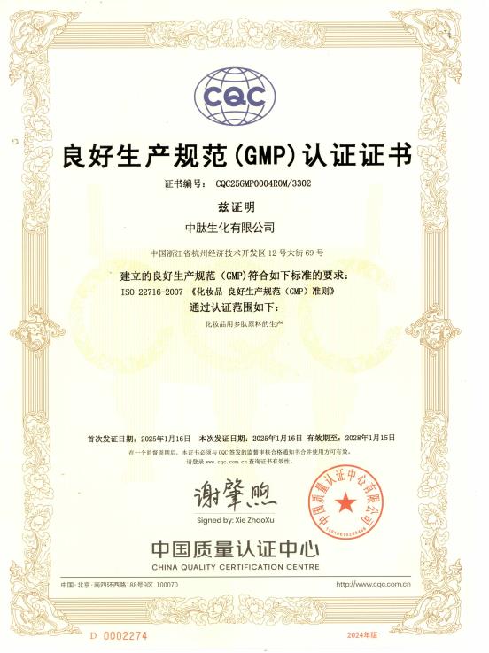 近日,中肽生化有限公司成功通過(guò)ISO 22716:2007《化妝品-良好生產(chǎn)質(zhì)量管理規(guī)范指引》認(rèn)證審核。這一認(rèn)證的順利通過(guò),標(biāo)志著中肽在化妝品生產(chǎn)管理能力方面已與國(guó)際標(biāo)桿接軌,充分彰顯了公司在生產(chǎn)安全、質(zhì)量穩(wěn)定及交付能力上的強(qiáng)勁實(shí)力,為持續(xù)輸出優(yōu)質(zhì)、安全的產(chǎn)品奠定了堅(jiān)實(shí)基礎(chǔ)。