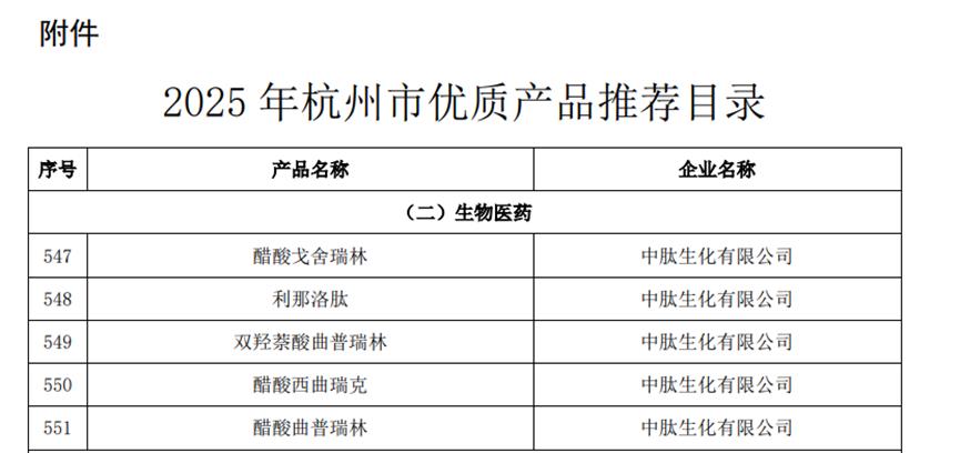 2025年6月9日,根據(jù)《關(guān)于組織申報2025年杭州市優(yōu)質(zhì)產(chǎn)品推薦目錄的通知》要求,經(jīng)企業(yè)申報、區(qū)縣初審、市級審核、公開公示等程序,杭州市經(jīng)濟和信息化局(杭州市數(shù)字經(jīng)濟局)確定1226項產(chǎn)品列入《2025年杭州市優(yōu)質(zhì)產(chǎn)品推薦目錄》。中肽生化旗下醋酸戈舍瑞林、利那洛肽、雙羥萘酸曲普瑞林、醋酸西曲瑞克、醋酸曲普瑞林五項產(chǎn)品榮耀上榜!