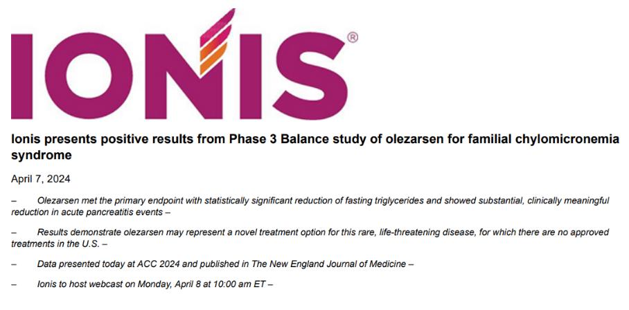 2024年4月7日,Ionis Pharmaceuticals公布了Olezarsen治療家族性高乳糜微粒血癥綜合征(FCS)的III期Balance研究全部結(jié)果,每月80mg Olezarsen治療組在6個(gè)月時(shí)達(dá)到了顯著降低患者甘油三酯水平的主要終點(diǎn)。此外,Olezarsen還能持續(xù)降低載脂蛋白-III(apoC-III)水平。更為重要的是,與安慰劑相比,在12個(gè)月治療期內(nèi)Olezarsen降低了急性胰腺炎的發(fā)生率。