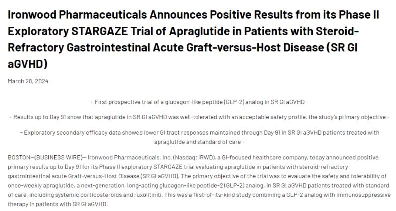 2024年3月28日,Ironwood Pharmaceuticals宣布,在研療法apraglutide在治療類固醇難治性胃腸道急性移植物抗宿主?。⊿R GI aGVHD)患者的探索性臨床試驗STARGAZE中獲得積極結(jié)果。Apraglutide表現(xiàn)出良好的安全性和耐受性,并且大部分患者在接受治療后第28天和第56天產(chǎn)生應答。Apraglutide是一款長效胰高血糖素樣肽-2(GLP-2)類似物,最初由VectivBio公司開發(fā)。Ironwood Pharmaceuticals去年斥資超10億美元收購了VectivBio公司,囊獲這款處于后期臨床開發(fā)的創(chuàng)新療法。