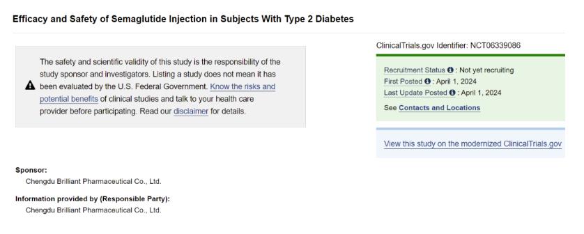 2024年4月1日,倍特藥業(yè)在Clinicaltrials.gov網(wǎng)站上注冊了司美格魯肽治療二型糖尿病的三期臨床試驗。