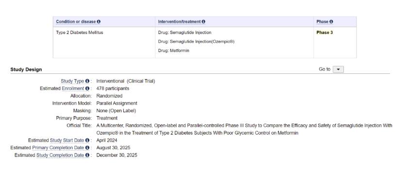 該三期臨床計劃入組478例二型糖尿病患者,與Ozempic頭對頭,預計2025年8月初步完成。