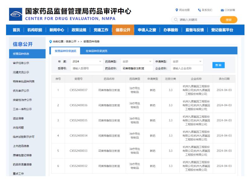 2024年4月2日,杭州九源基因工程股份有限公司(以下簡稱“九源基因”)遞交了司美格魯肽注射液(商品名:吉優(yōu)泰)的上市申請并獲受理(受理號:CXSS2400032、CXSS2400033、CXSS2400034、CXSS2400035、CXSS2400036、CXSS2400037),適應癥為用于成人2型糖尿病患者的血糖控制。這是國內(nèi)第一家申報上市的司美格魯肽生物類似藥。