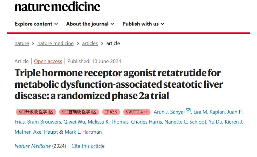 近日,禮來在《Nature Medcine》期刊上發(fā)表了GLP-1R/GCGR/GIPR激動劑Retatrutide(LY3437943)治療代謝功能障礙相關脂肪性肝病(MASLD,舊稱非酒精性脂肪性肝病(NASLD))的IIa期研究(NCT04881760)數(shù)據(jù)??傮w而言,Retatrutide在降低MASLD患者的肝臟脂肪含量上有非常不錯的效果,最高降幅可達86%。