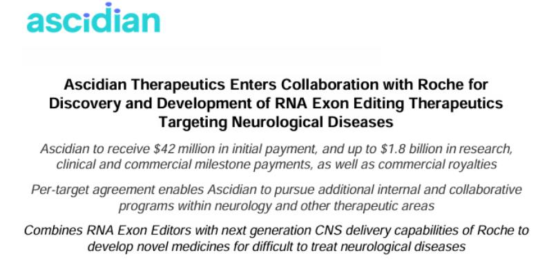 2024年6月18日,Ascidian Therapeutics公司宣布與羅氏公司簽署了一項開發(fā)針對神經(jīng)系統(tǒng)疾病的RNA外顯子編輯療法的潛在合作協(xié)議。Ascidian將獲得4200萬美元的首付款,并有資格獲得高達18億美元的研究、臨床和商業(yè)里程碑付款,以及全球商業(yè)銷售的特許權使用費。