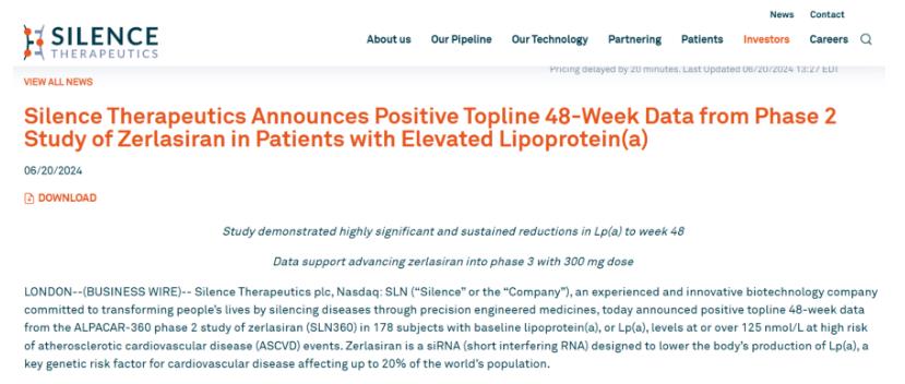 2024年6月20日,Silence Therapeutics公布了siRNA療法Zerlasiran(SLN360)治療脂蛋白(a)水平升高患者的II期ALPACAR-360研究的48周結果。