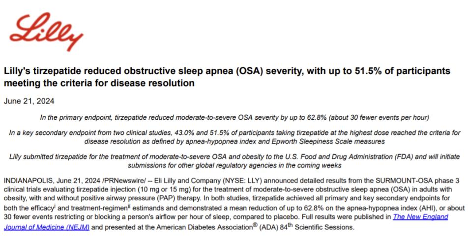 2024年4月17日,禮來宣布替爾泊肽治療肥胖合并睡眠呼吸暫停(OSA)的兩項(xiàng)三期臨床獲得成功。6月21日,這兩項(xiàng)三期臨床的詳細(xì)數(shù)據(jù)在NEJM期刊和ADA會議上同步發(fā)表。