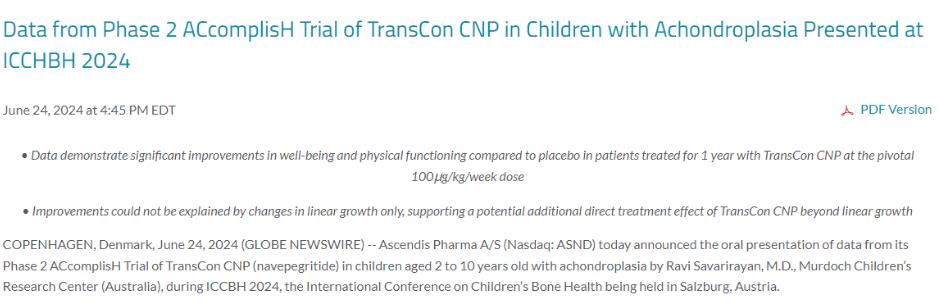 2024年6月24日,Ascendis Pharma A/S (Nasdaq: ASND)宣布,在ICCBH 2024期間,澳大利亞默多克兒童研究中心的Ravi Savarirayan醫(yī)學(xué)博士口頭報告了TransCon CNP (navepegritide)治療2至10歲軟骨發(fā)育不全兒童的二期臨床試驗(yàn)數(shù)據(jù)。