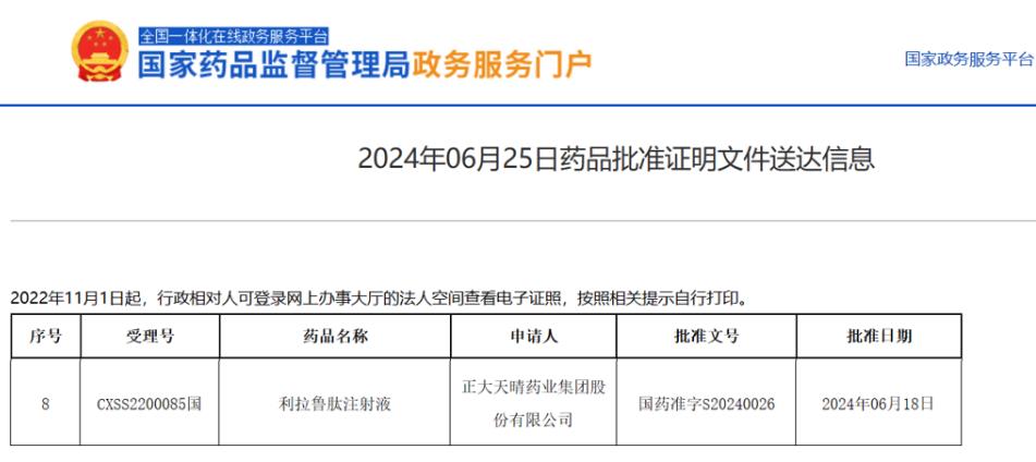 2024年6月25日,國家藥監(jiān)局(NMPA)官網(wǎng)顯示,正大天晴的利拉魯肽注射液獲批上市,用于治療2型糖尿病。