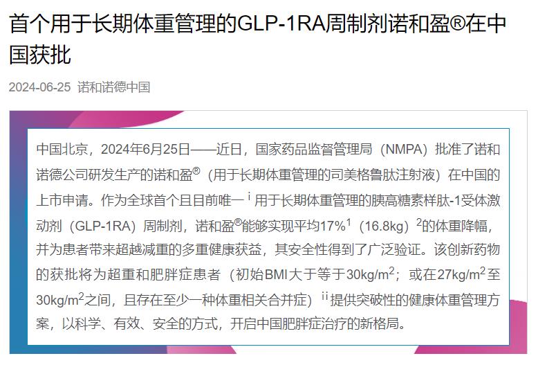 2024年6月25日,諾和諾德宣布司美格魯肽注射液的新適應(yīng)癥獲國家藥監(jiān)局批準(zhǔn)上市(商品名:諾和盈®),作為低卡路里飲食和增加體力活動的輔助治療用于初始體重指數(shù)(BMI)≥30kg/m2(肥胖),或≥27kg/m2且<30kg/m2(超重)并且伴有至少一種與超重相關(guān)合并癥的成人患者。