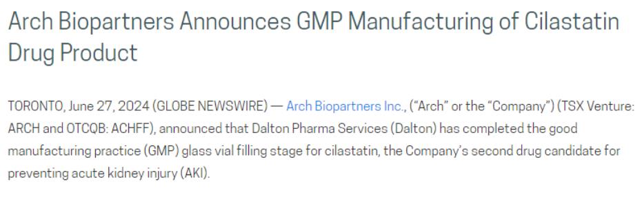 2024年6月27日,Arch bioppartners Inc.宣布Dalton Pharma Services (Dalton)已經(jīng)完成了西司他汀的GMP生產(chǎn),西司他汀是該公司第二種用于預(yù)防急性腎損傷(AKI)的候選藥物。