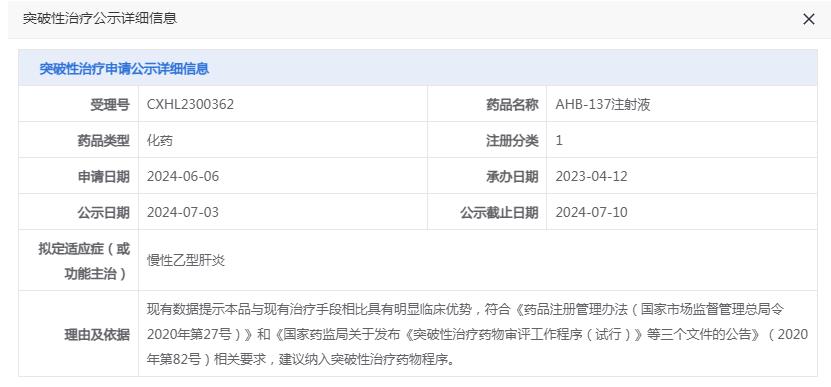 2024年7月3日,中國國家藥監(jiān)局藥品審評中心(CDE)官網(wǎng)公示,杭州浩博醫(yī)藥有限公司(簡稱“浩博醫(yī)藥”)申報的ABH-131注射液擬納入突破性治療品種名單。資料顯示,本品擬用于治療慢性乙型肝炎患者。