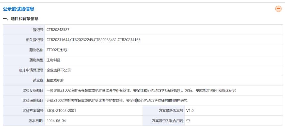 2024年7月12日,藥物臨床試驗登記與信息公示平臺顯示,質(zhì)肽生物啟動了旗下新型超長效胰高血糖素樣肽-1受體(GLP-1R)激動劑ZT002注射液用于超重或者肥胖患者的II期臨床研究(登記號:CTR20242527)。