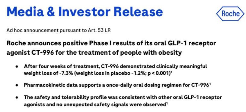 2024年7月17日,羅氏宣布CT-996 I期臨床試驗中的兩個治療組取得了積極結(jié)果。數(shù)據(jù)顯示,對無2型糖尿病的肥胖受試者接受CT-996治療在4周后,經(jīng)安慰劑調(diào)整后的平均體重減輕幅度達到了-6.1%(p <0.001)。