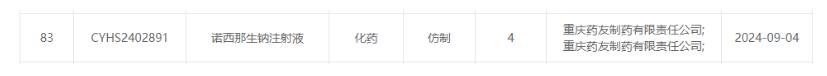 2024年9月4日,據(jù)國(guó)家藥品監(jiān)督管理局藥品審評(píng)中心 (CDE) 顯示,重慶藥友制藥有限責(zé)任公司的4類仿制藥諾西那生鈉注射液申報(bào)生產(chǎn)獲受理。