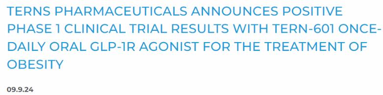 2024年9月9日,Terns Pharmaceuticals宣布其口服GLP-1R激動(dòng)劑TERN-601的Ⅰ期試驗(yàn)結(jié)果,結(jié)果顯示,TERN-601的最高劑量組達(dá)到了4.9%的安慰劑調(diào)整平均體重減輕,患者每天接受一次TERN-601。公司還表示,這組67%的參與者減掉了5%或更多的基線體重。