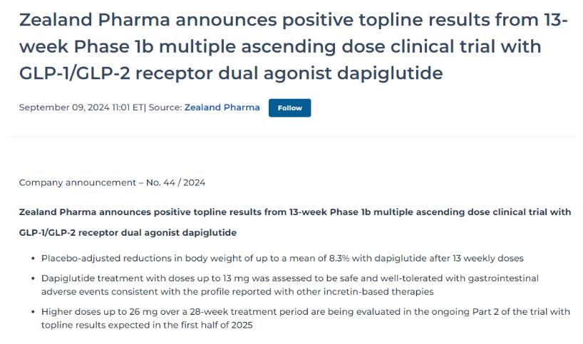 2024年9月10日,Zealand Pharma公布了其GLP-1/GLP-2受體雙激動(dòng)劑dapiglutide在1b期多次遞增劑量臨床試驗(yàn)的最新積極結(jié)果。Dapiglutide是一種潛在“first-in-class”的長(zhǎng)效肽療法,旨在利用強(qiáng)效GLP-1激動(dòng)劑的效果來(lái)減重,并通過(guò)GLP-2的腸道屏障改善功能來(lái)解決與低級(jí)別炎癥相關(guān)的并發(fā)癥。