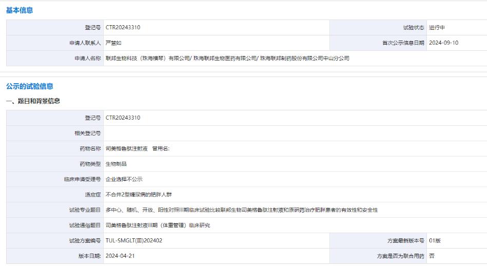 2024年9月10日,中國(guó)國(guó)家藥監(jiān)局藥品審評(píng)中心(CDE)官網(wǎng)顯示聯(lián)邦制藥啟動(dòng)一項(xiàng)多中心、隨機(jī)、開放、陽(yáng)性對(duì)照 III 期臨床試驗(yàn),比較聯(lián)邦生物司美格魯肽注射液和原研藥治療肥胖患者的有效性和安全性。值得注意的是,這是國(guó)內(nèi)第三款啟動(dòng)肥胖 III 期臨床的司美格魯肽。
