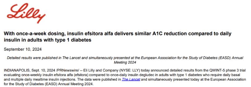 2024年9月10日,禮來(lái)公布每周一針胰島素Insulin efsitora治療一型糖尿病、二型糖尿病三期臨床詳細(xì)數(shù)據(jù),分別發(fā)表在柳葉刀、新英格蘭醫(yī)學(xué)期刊上,同時(shí)在EASD會(huì)議上公開。