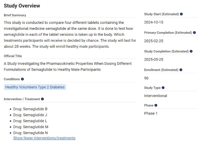 2024年10月15日,諾和諾德在Clinicaltrials.gov網(wǎng)站上注冊了司美格魯肽口服制劑的一期臨床試驗。