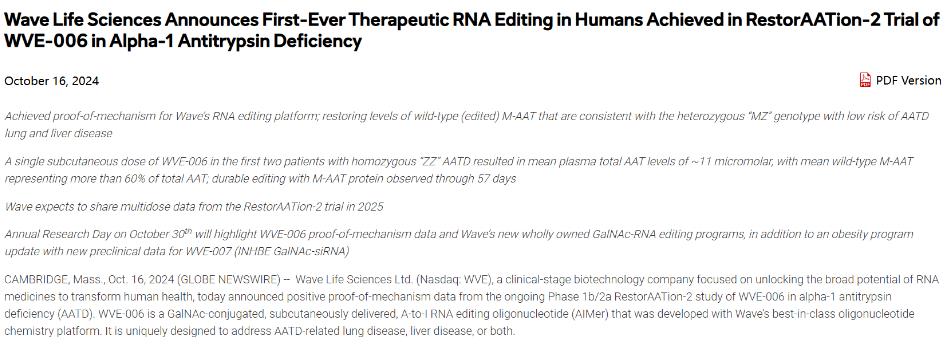 2024年10月16日,Wave Life Sciences公布了RNA編輯療法WVE-006治療α-1抗胰蛋白酶缺乏癥(AATD)的Ib/IIa期RestorAATion-2研究的積極機制證明數(shù)據(jù)。這是首個公布臨床數(shù)據(jù)的RNA編輯療法。