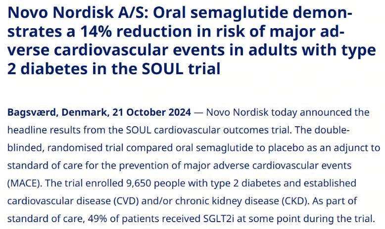 2024年10月21日,諾和諾德宣布SOUL心血管結(jié)局試驗(yàn)的主要結(jié)果。這項(xiàng)雙盲隨機(jī)試驗(yàn)比較了口服司美格魯肽(Rybelsus)對比安慰劑作為標(biāo)準(zhǔn)護(hù)理的輔助治療方法,以預(yù)防重大不良心血管事件(MACE)的發(fā)生。該試驗(yàn)共招募了9650名2型糖尿病患者,這些患者已確診心血管疾?。–VD)和/或慢性腎病(CKD)。作為標(biāo)準(zhǔn)治療的一部分,49%的患者在試驗(yàn)期間的某個階段接受了 SGLT2i 治療。