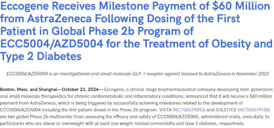 2024年10月23日,誠益生物宣布收到阿斯利康6000萬美元里程碑付款,這筆款項(xiàng)將在ECC5004/AZD5004的開發(fā)成功實(shí)現(xiàn)里程碑后支付。阿斯利康于2023年11月從誠益生物獲得了ECC5004/AZD5004的全球使用權(quán),誠益生物為此獲得了1.85億美元的預(yù)付款,并可在未來獲得高達(dá)18.25億美元的里程碑獎勵以及專利使用費(fèi)。誠益生物保留ECC5004/AZD5004在中國的共同開發(fā)和共同商業(yè)化權(quán)利。
