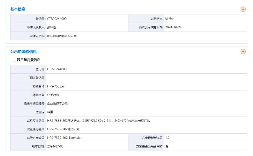 2024年10月23日,藥物臨床試驗(yàn)登記與信息公示平臺顯示,恒瑞醫(yī)藥子公司山東盛迪醫(yī)藥正在開展一項(xiàng)關(guān)于HRS-7535片的II期臨床隨訪研究(CTR20244009),以長期評估該藥物對肥胖受試者的安全性、耐受性和有效性。該研究早在今年8月15日獲得中國人民解放軍總醫(yī)院醫(yī)學(xué)倫理委員會審批同意。