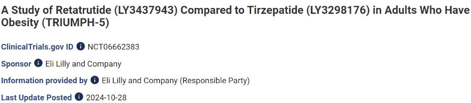 2024年10月28日,禮來(lái)注冊(cè)了GLP-1/GIP/GCG三靶點(diǎn)激動(dòng)劑Retatrutide的第9項(xiàng)三期臨床試驗(yàn),頭對(duì)頭替爾泊肽用于減重。