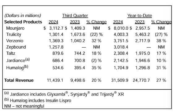 2024年10月30日,禮來(lái)公布2024Q3財(cái)報(bào),前三季度營(yíng)收315億美元,同比增長(zhǎng)27%。第三季度營(yíng)收114.4億美元,同比增長(zhǎng)20%,但低于市場(chǎng)預(yù)期的121.8億美元