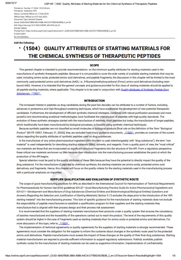 政策法規(guī) | Quality Attributes of Starting Materials for the Chemical Synthesis of Therapeutic Peptide
