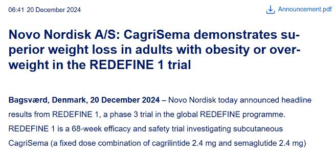 2024年12月20日,諾和諾德宣布了III期試驗(yàn)REDEFINE 1的結(jié)果。在第68周時(shí),CagriSema的減肥效果明顯優(yōu)于安慰劑,達(dá)到了主要終點(diǎn)。