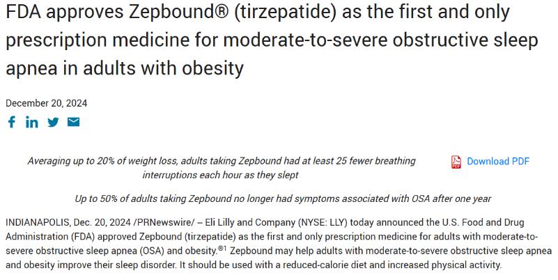 2024年12月20日,禮來(lái)(Eli Lilly and Company)宣布,F(xiàn)DA已批準(zhǔn)其GLP-1R/GIPR雙重激動(dòng)劑替爾泊肽(Zepbound)作為首個(gè)也是唯一用于治療中重度阻塞性睡眠呼吸暫停(OSA)合并肥胖癥成人患者的處方藥。在使用替爾泊肽的同時(shí),應(yīng)減少熱量飲食并增加體育鍛煉。