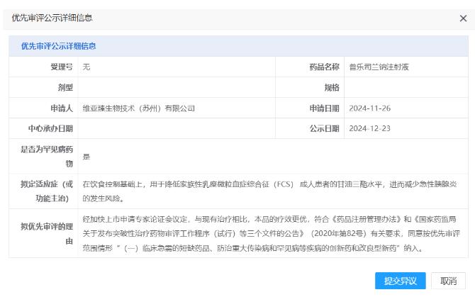 2024年12月23日,維亞臻 1 類(lèi)新藥普樂(lè)司蘭鈉注射液(VSA001)擬納入優(yōu)先審評(píng),在飲食控制基礎(chǔ)上,用于降低家族性乳糜微粒血癥綜合征(FCS)成人患者的甘油三酯水平,進(jìn)而減少急性胰腺炎的發(fā)生風(fēng)險(xiǎn)。目前該適應(yīng)癥已經(jīng)在美國(guó)處于上市申請(qǐng)階段。這也是該靶點(diǎn)全球首個(gè)申報(bào)上市的藥物。
