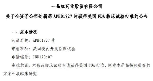 2024年12月23日,一品紅藥業(yè)發(fā)布公告,其全資子公司廣州一品紅制藥申報(bào)的創(chuàng)新藥物 APH01727片已獲美國(guó)FDA批準(zhǔn)開(kāi)展臨床試驗(yàn),擬用于2型糖尿病的治療。