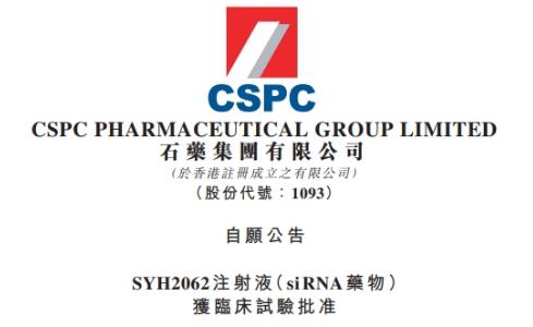 2024年12月23日,石藥集團(tuán)宣布,公司自主研發(fā)的化學(xué)1類(lèi)新藥SYH2062注射液(雙鏈小干擾RNA(siRNA)藥物)(下稱(chēng):該產(chǎn)品)已獲得中華人民共和國(guó)國(guó)家藥品監(jiān)督管理局批準(zhǔn),可以在中國(guó)開(kāi)展臨床試驗(yàn)。