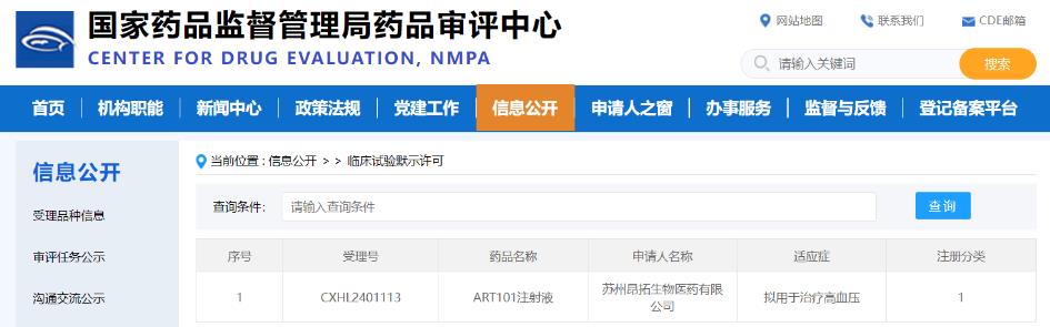 近日,蘇州昂拓生物醫(yī)藥有限公司(簡稱“昂拓生物”) 自主研發(fā)的新化學(xué)實(shí)體Ⅰ類新藥 ART101 注射液獲得國家藥品監(jiān)督管理局藥品審評中心(CDE)臨床試驗(yàn)?zāi)驹S可(受理號 CXHL2401113),該藥物擬用于治療高血壓。