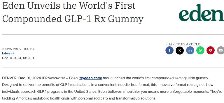 2024年12月31日,Eden宣布上市司美格魯肽咀嚼軟糖,這是全球第一款司美格魯肽咀嚼軟糖。Eden旨在以無需針頭注射的便捷形式提供司美格魯肽等GLP-1藥物的益處,并推動實(shí)現(xiàn)患者的個性化用藥。