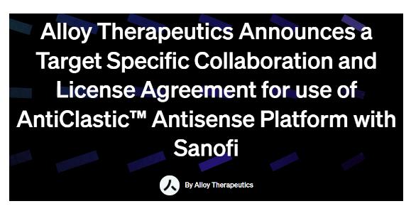 2025年1月7日,Alloy Therapeutic宣布與賽諾菲就前者創(chuàng)新且專有的AntiClastic Antisense平臺達(dá)成針對中樞神經(jīng)系統(tǒng)(CNS)靶點(diǎn)的特定目標(biāo)合作和許可協(xié)議。通過此次合作,賽諾菲將利用其神經(jīng)科學(xué)專業(yè)知識,與Alloy合作使用AntiClastic Antisense平臺向大腦遞送治療藥物,旨在開發(fā)一類能夠穿越血腦屏障的新型遺傳藥物。