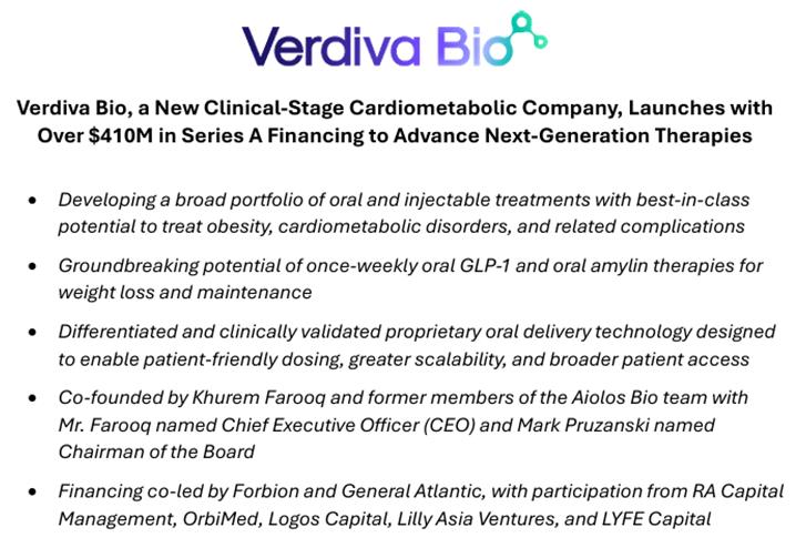 2025年1月9日,一家開發(fā)針對肥胖癥和其他心血管代謝紊亂創(chuàng)新療法的生物技術(shù)公司Verdiva Bio宣布成立,在超額認(rèn)購下獲得了4.11億美元的A輪融資。Verdiva的研發(fā)管線包含從先為達(dá)授權(quán)的3個候選藥物,其中包括一款即將進(jìn)入II期臨床的口服GLP-1激動劑,該藥只需每周給藥一次,Verdiva認(rèn)為這將使其在眾多競爭產(chǎn)品中脫穎而出,因?yàn)槟壳霸谘械耐惪诜幬锎蠖嘈枰咳战o藥。另外兩個候選藥物分別是每周給藥一次的口服胰淀素(Amylin)激動劑和長效皮下胰淀素激動劑。