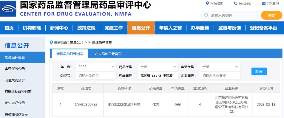 2025年2月18日,北京先通國際醫(yī)藥科技股份有限公司(先通醫(yī)藥)研發(fā)的4類(境內(nèi)仿制藥)放射性治療藥物氯化鐳[223Ra]注射液的申報(bào)生產(chǎn)申請獲國家藥品監(jiān)督管理局藥品審評中心受理公開。2020年8月27日,國家藥品監(jiān)督管理局(NMPA)批準(zhǔn)了拜耳公司的氯化鐳[223Ra]注射液(商品名:多菲戈®或Xofigo®)在國內(nèi)上市,用于治療伴癥狀性骨轉(zhuǎn)移且無已知內(nèi)臟轉(zhuǎn)移的去勢抵抗性前列腺癌(CRPC)患者。