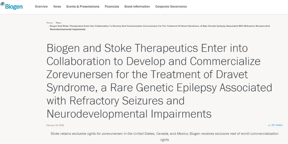 2025年2月18日,渤健公司(Biogen, 納斯達(dá)克股票代碼:BIIB)與Stoke Therapeutics公司(納斯達(dá)克股票代碼:STOK)宣布達(dá)成一項(xiàng)合作,在除北美以外的所有地區(qū),共同開發(fā)和商業(yè)化zorevunersen。根據(jù)協(xié)議,Stoke將獲得1.65億美元預(yù)付款,并有望獲得高達(dá)3.85億美元的里程碑付款以及特許權(quán)使用費(fèi)。