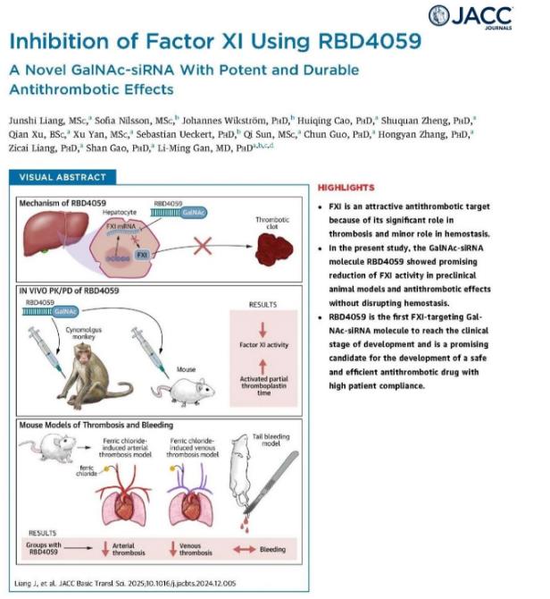 2025年2月19日,蘇州瑞博生物技術(shù)股份有限公司(下稱“瑞博生物”)的臨床管線RBD4059臨床前研究文章在《美國心臟病學(xué)會(huì)雜志》)子刊《基礎(chǔ)到轉(zhuǎn)化科學(xué)》(JACC: Basic to Translational Science)發(fā)表。文章題為《抑制凝血因子XI(FXI)的全新GalNAc-siRNA 藥物RBD4059強(qiáng)效和持久的抗血栓作用》(“Inhibition of Factor XI Using RBD4059: A Novel GalNAc-siRNA With Potent and Durable Antithrombotic Effects”),向全球展示了瑞博生物對于FIC和BIC小核酸藥物開發(fā)的能力和信心,同時(shí)有希望為抗血栓領(lǐng)域帶來革命性治療手段。