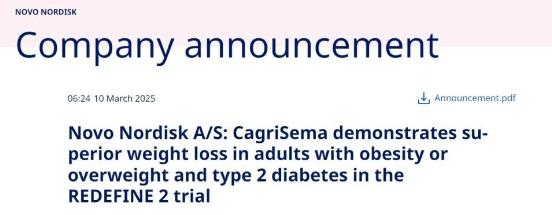 2025年3月10日,諾和諾德公布其重磅減重藥物CagriSema(卡格列肽+司美格魯肽復(fù)方制劑)的REDEFINE 2臨床試驗(yàn)結(jié)果。盡管數(shù)據(jù)顯示該藥物對(duì)肥胖患者有“卓越的”減重效果,患者體重平均下降15.7%,但仍低于市場(chǎng)預(yù)期的近20%。
