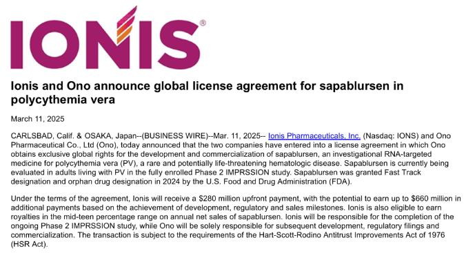 2025年3月11日,Ionis Pharmaceuticals和小野制藥(Ono Pharmaceutical)宣布,兩家公司已達(dá)成一項(xiàng)獨(dú)家全球授權(quán)協(xié)議。Ono將獲得sapablursen開發(fā)和商業(yè)化的全球獨(dú)家權(quán)利,這是一種針對(duì)真性紅細(xì)胞增多癥(PV)的在研RNA靶向藥物。