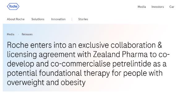 Zealand Pharma和羅氏將共同在美國(guó)和歐洲商業(yè)化petrelintide,而羅氏將獲得在世界其他地區(qū)的獨(dú)家商業(yè)化權(quán)利。羅氏將負(fù)責(zé)商業(yè)化制造和供應(yīng)。
