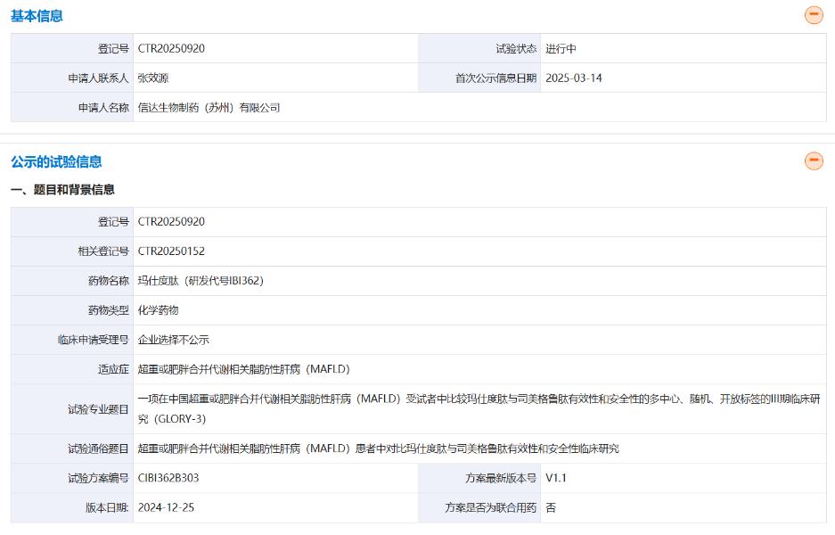 2025年3月14日,藥物臨床試驗(yàn)登記與信息公示平臺(tái)顯示,信達(dá)啟動(dòng)了一項(xiàng)在中國(guó)超重或肥胖合并代謝相關(guān)脂肪性肝?。∕AFLD)受試者中比較瑪仕度肽與司美格魯肽有效性和安全性的多中心、隨機(jī)、開(kāi)放標(biāo)簽的III期臨床研究(GLORY-3)。