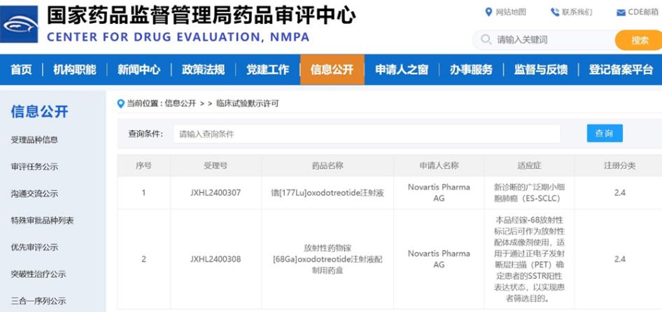2025年3月14日,諾華研發(fā)的1類放射性治療藥物[177Lu]oxodotreotide注射液及鎵[68Ga]oxodotreotide注射液藥盒的臨床試驗(yàn)申請(qǐng)獲得國(guó)家藥品監(jiān)督管理局藥品審評(píng)中心默示許可。同意其開(kāi)展“新診斷的廣泛期小細(xì)胞肺癌(ES-SCLC)”及“適用于通過(guò)正電子發(fā)射斷層掃描(PET)確定患者的SSTR陽(yáng)性表達(dá)狀態(tài),以實(shí)現(xiàn)患者篩選目的”的臨床研究。