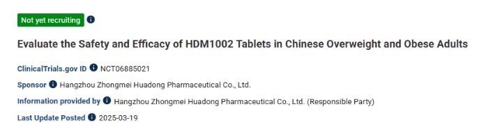 2025年3月19日,全球臨床試驗(yàn)收錄網(wǎng)站clinicaltrials顯示,華東醫(yī)藥啟動(dòng)了小分子GLP-1受體(GLP-1R)激動(dòng)劑HDM1002的首個(gè)III期臨床試驗(yàn)。這是第3款進(jìn)入III期臨床階段的國(guó)產(chǎn)小分子GLP-1R激動(dòng)劑。